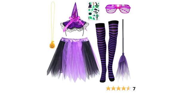 Amazon Com 7 Pcs Halloween Tutu With Witch Hat Halloween Witch Costume For Girls Women Tutu Skirt Striped Tights Witch Brooms Shutter Glasses Pumpkin Necklace Halloween Tattoos For Halloween Cosplay Costume Clothing